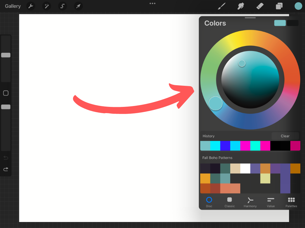 How to: In the upper right hand corner there is a colorful circle. This is where you find all of the many color options for selecting the color of your brush. Tap the circle to open and you will see two concentric circles with draggable dots inside. The outer circle is the color wheel that allows you to choose which color family you would like. Drag the dot in the inner circle to choose the saturation, brightness and intensity of your color. Play with this for a few minutes and you will probably have a good understanding.